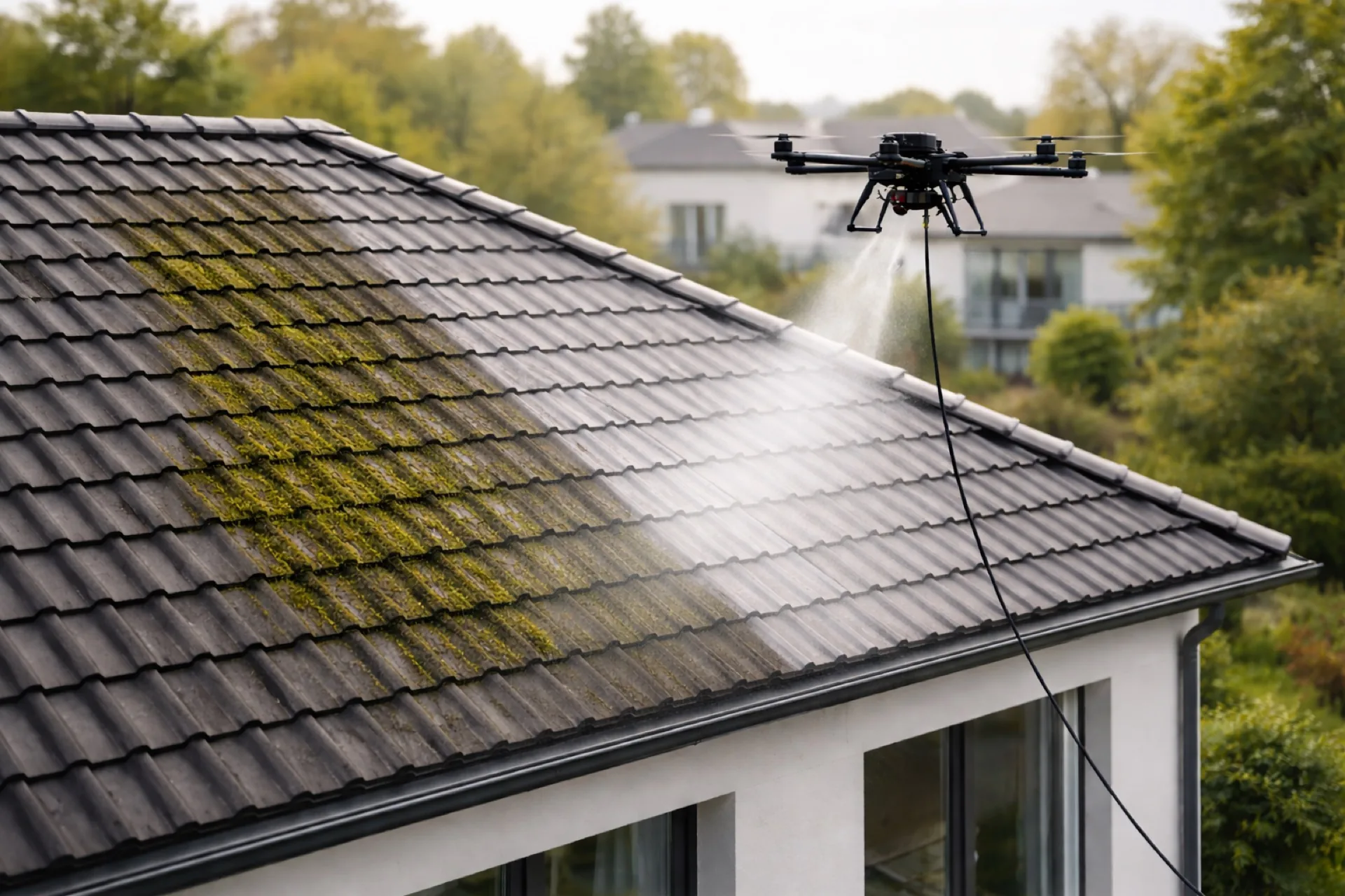 Un nettoyage précis qui redonne à votre toiture son aspect d’origine, sans contact direct.